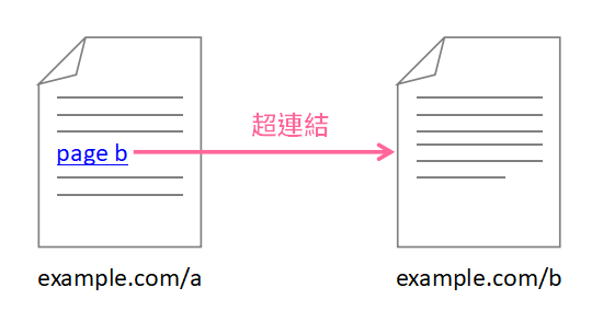 內部連結(internal link),指的是在同一個網站上,指向另一個頁面的超連結,可能出現在網頁上方的導覽列、側邊欄、最下方的footer,或是內文的文字或圖片連結。如下圖的範例,是example.com/a 頁面內文中有一個文字超連結指向example.com/b。